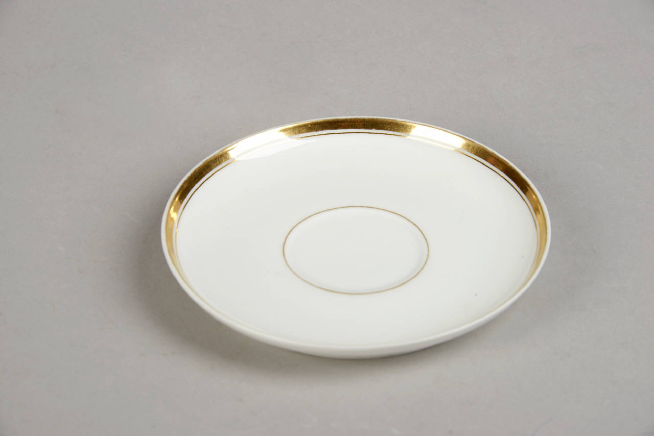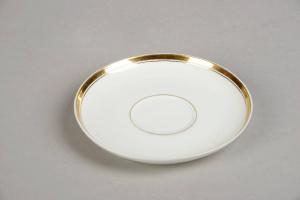 Piatto tondo con decorazione riservata a filetto e sottile fascia in monocromia oro.
