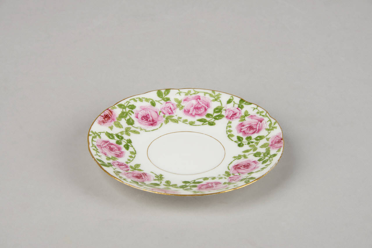 Piatto piano. L'ornato è costituito da rose di colore rosa, legate tra loro da un filo fogliato a volute e pendoni (di diverso disegno) in monocromia verde pisello; gli orli e i passaggi di piano sono sottolineati da fili d'oro.
