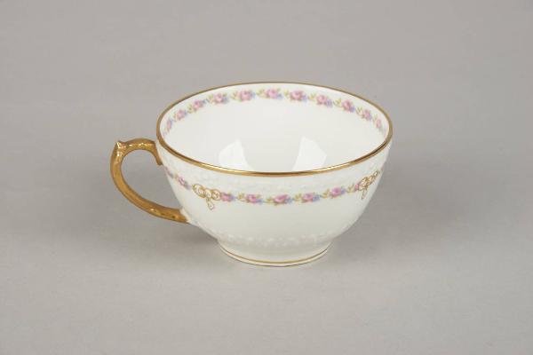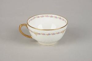 Tazza con un motivo a nastro floreale in sottile rilievo. Da questo si sviluppa il decoro pittorico a decalcomania con un sottile catenella di roselline, "non-ti-scordar-di-me" e fogliette. L'orlo è dorato.