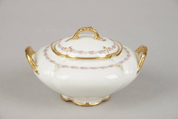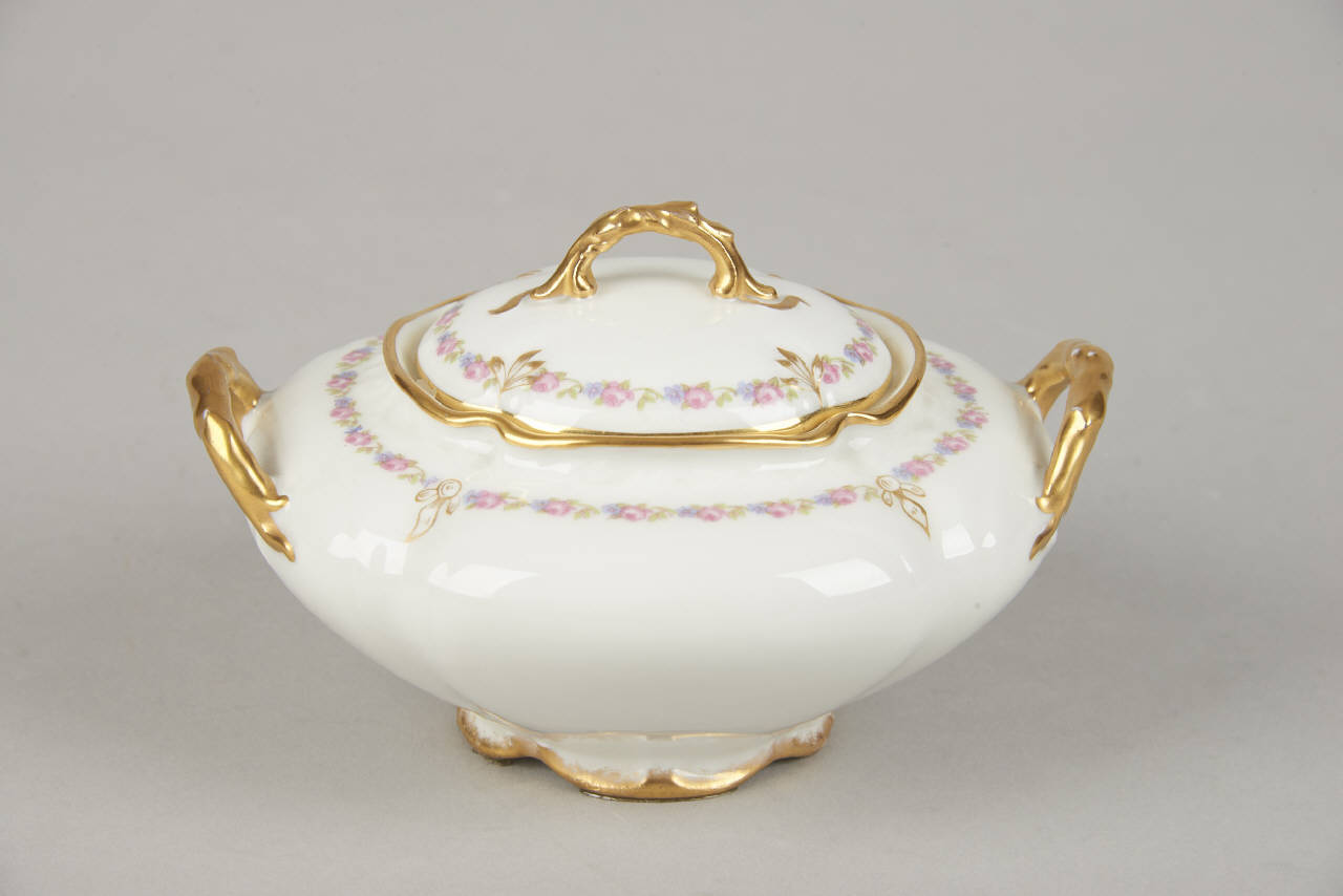 Zuccheriera ovale con un motivo a nastro floreale in sottile rilievo. Da questo si sviluppa il decoro pittorico a decalcomania con un sottile catenella di roselline, "non-ti-scordar-di-me" e fogliette. L'orlo è dorato.