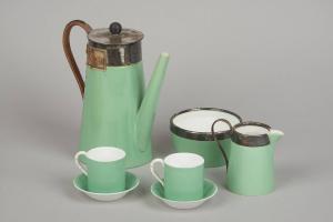 Servizio di colore verde e inserti in metallo a bordatura delle forme. Il servizio è composto da una caffettiera, una lattiera, sei tazzine con piattino e una zuccheriera.