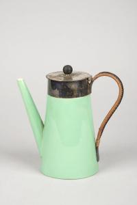 Caffettiera a tronco di cono di colore verde con coperchio in metallo, sormontato da un piccola sfera come presa; il manico è rivestito dall'intreccio di sottilissime fasce di cuoio.