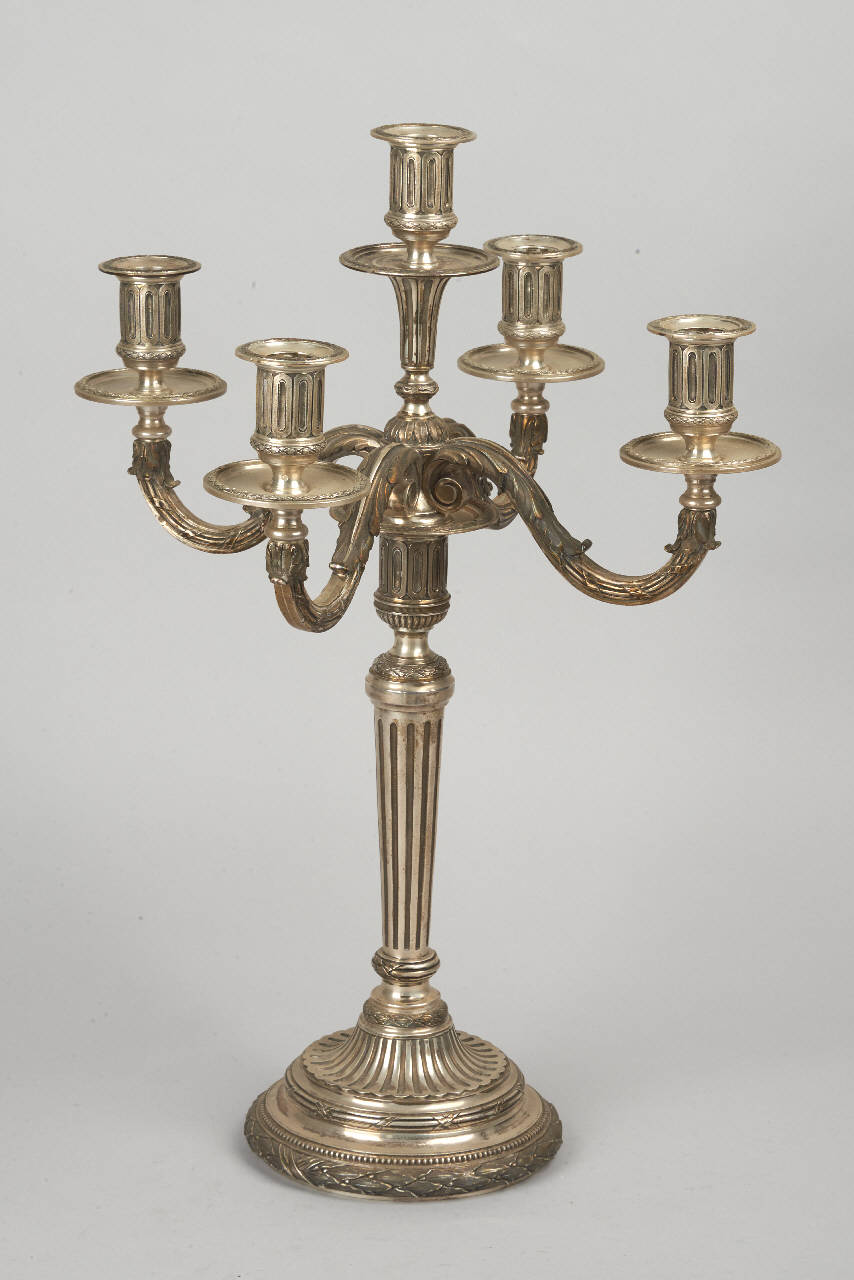 Candelabro a cinque bracci con fusto a colonna rastremato e scanalato. Bracci portacandela curvilinei con decoro a fogliame. Base circolare con decoro a corona d'alloro e fuselli.