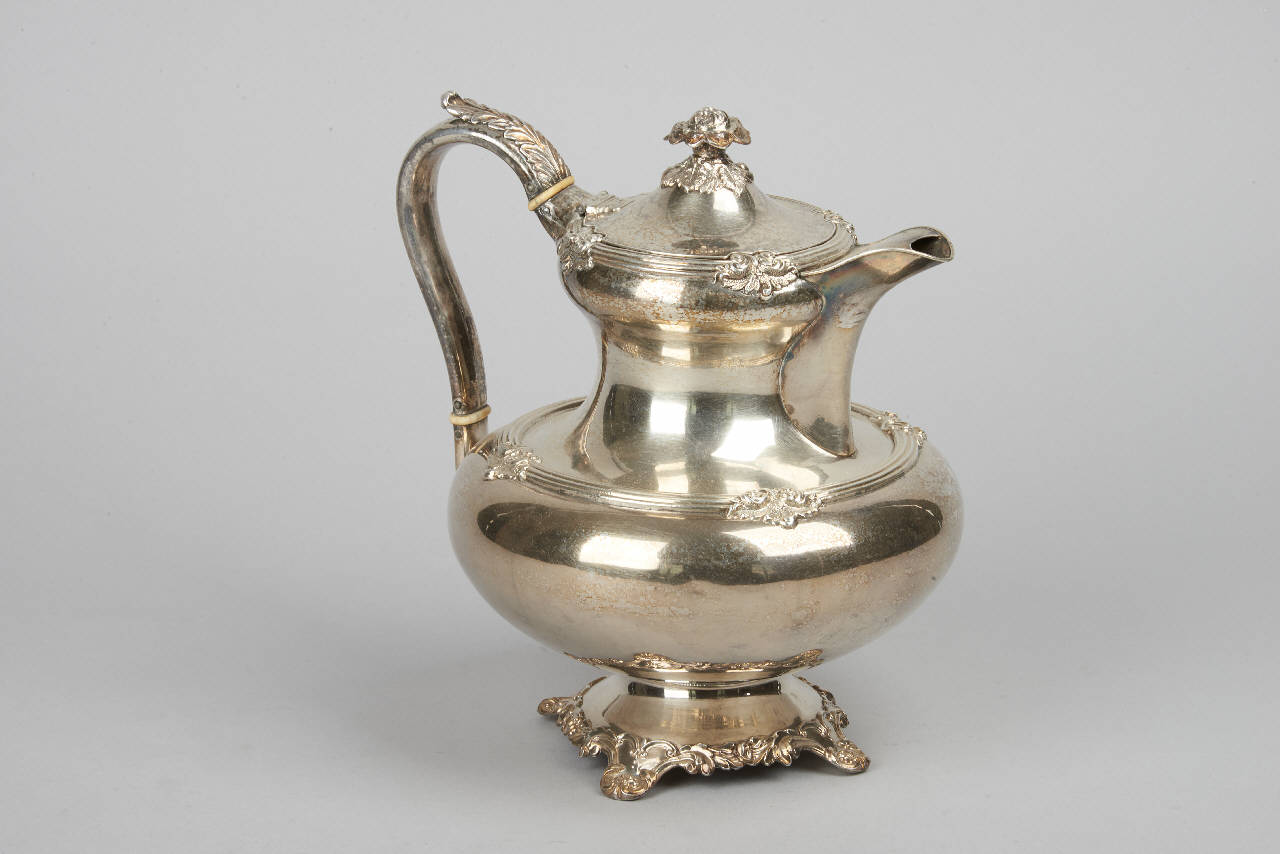 Caffettiera in argento Sheffield plate con piede quadrilobato, corpo semisferico, manico ad ansa e coperchio incernierato con rosetta sommitale. Decorazione a motivi fitomorfi.