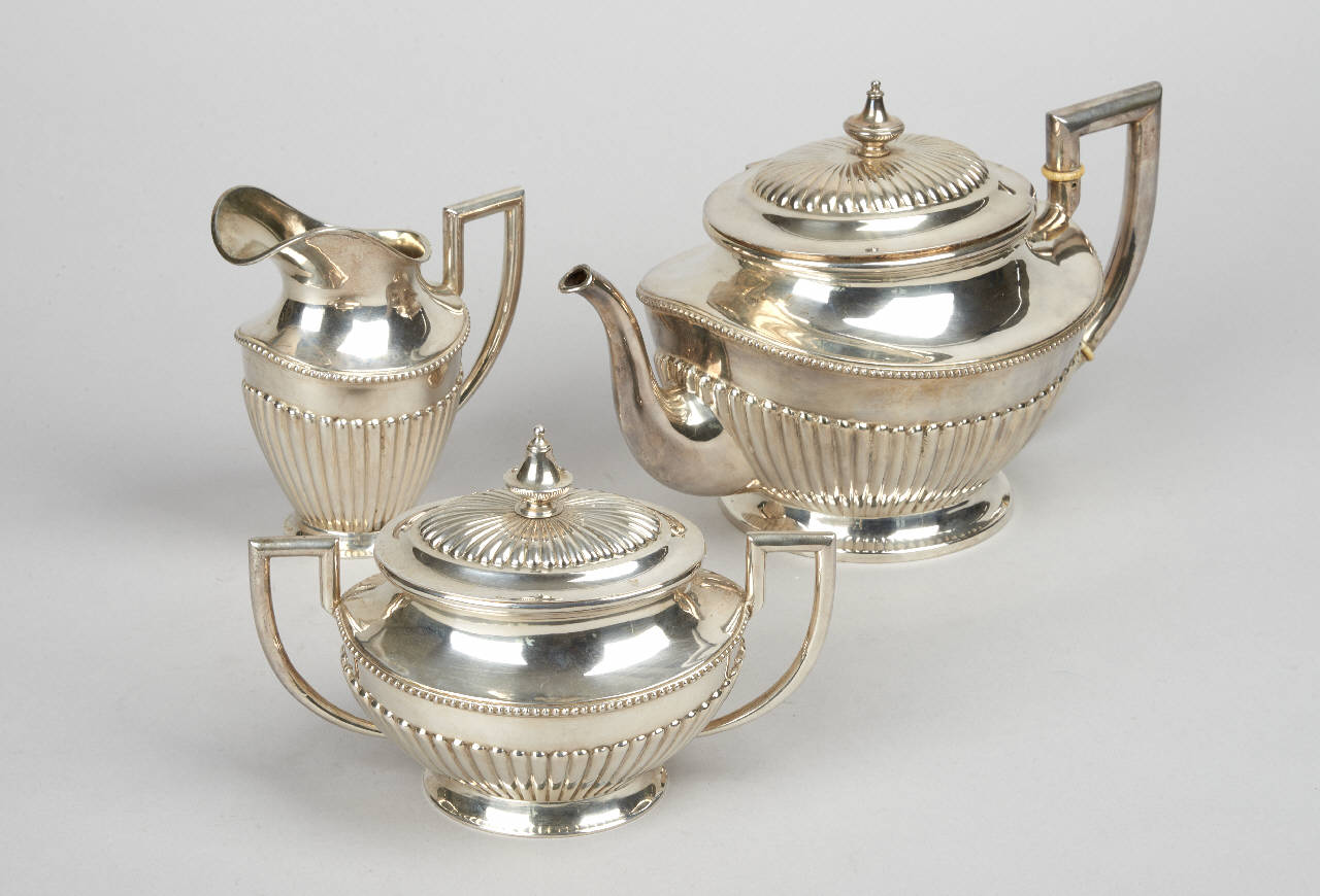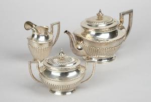 Servizio da thè in argento composto da teiera, lattiera e zuccheriera.