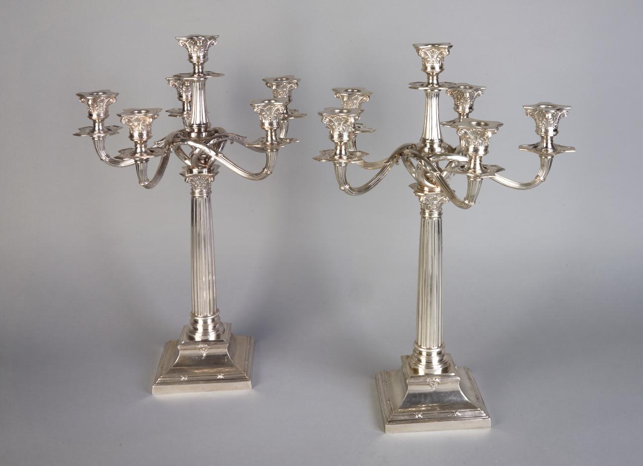Candelabro a sei bracci con base quadrangolare e fusto a colonna corinzia scalanata. Dal capitello della colonna si dipartono i bracci curvilinei, intrecciati tra loro.