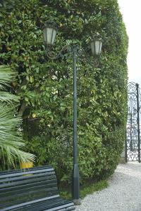 Lampione con palo centrale fissato a pavimento e due bracci simmetrici sommitali con andamento a voluta vegetale, reggenti i corpi illuminanti esagonali, decorati con volute e verniciati in verde scuro.