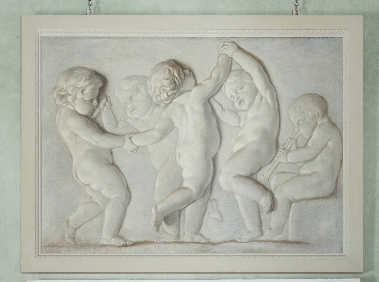 Tela dipinta a monocromo raffigurante quattro putti che danzano al suono di un flauto.