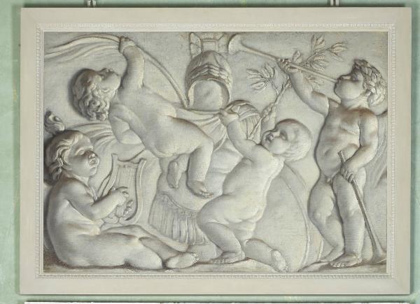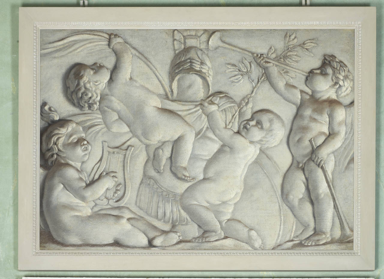 Tela dipinta a monocromo raffigurante due putti che suonano l'arpa e il flauto, mentre altri due stanno decorando un'armatura con un mantello, rami d'alloro e di palma (?).