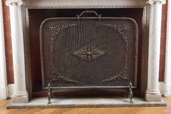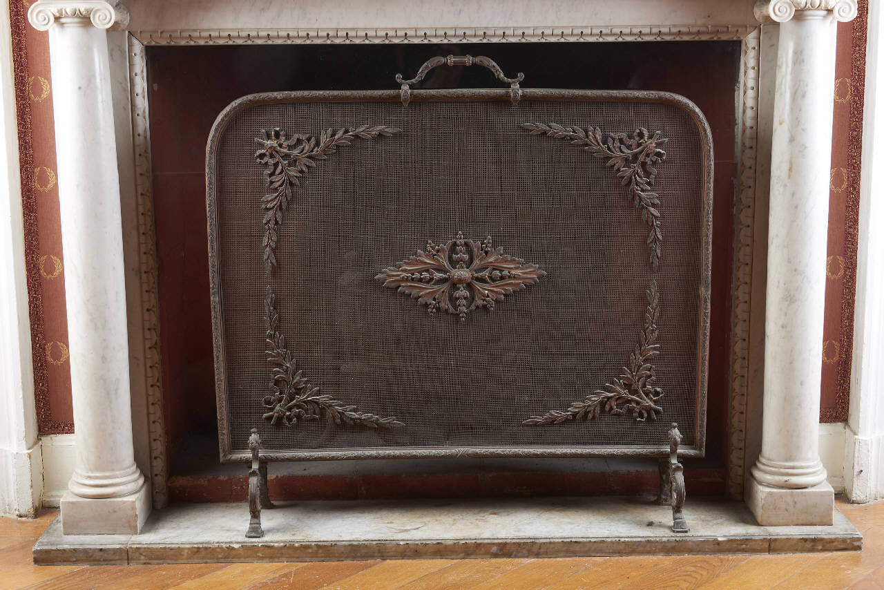 Parafuoco in bronzo dorato, con piedini a voluta, cornice a fogliette, maniglia tortile a decoro a rami d'alloro e decoro centrale a fiore circondato, agli angoli, da foglie d'alloro e nastri.