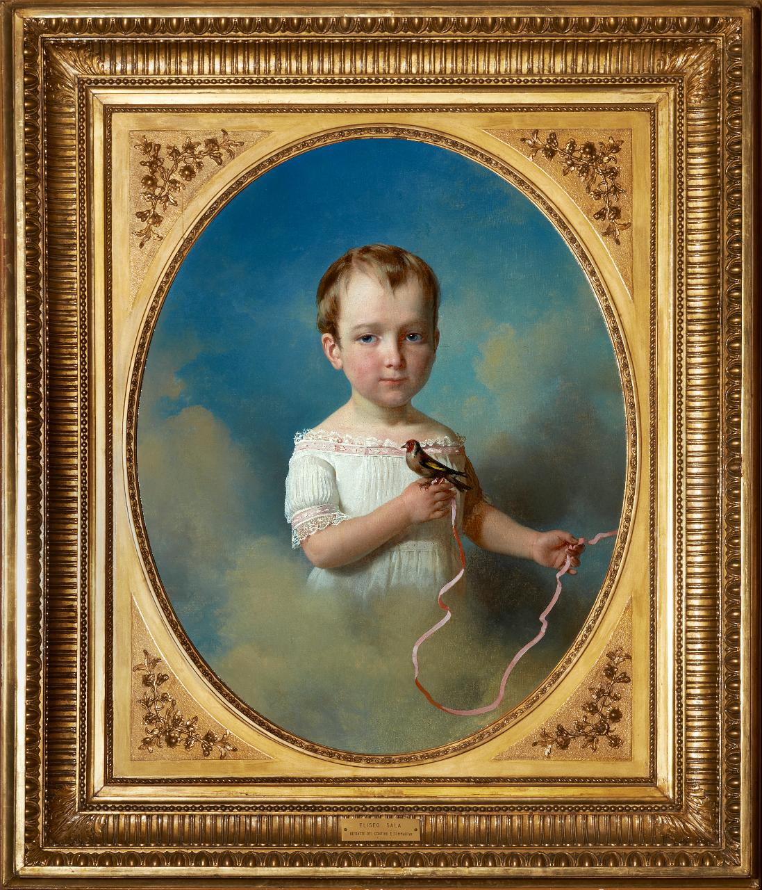 Quadro ovale raffigurante il contino Emilio Sommariva a mezzo busto che, emergente dalle nuvole, tiene nella mano destra un uccellino trattenuto da un nastro che stringe con la mano sinistra.
