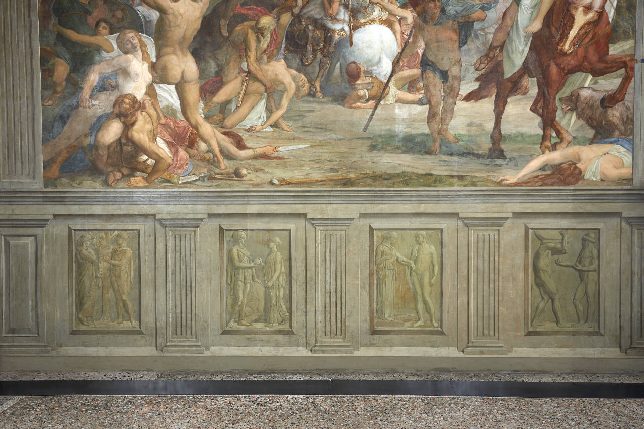 Medea e Giasone: affresco monocromo (primo da sinistra) raffigurante Medea, figura intera di profilo a sinistra di fronte a Giasone, figura intera con il volto di profilo sul corpo posto frontalmente, in atto di cogliere il vello d'oro.\nVenere e Paride: affresco monocromo (secondo da sinistra) raffigurante Paride, figura intera di profilo a sinistra di fronte a Venere, figura intera con il volto di profilo, in atto di ricevere il pomo d'oro.\nDeucalione e Pirra: affresco monocromo (terzo da sinistra) raffigurante Pirra, figura intera di profilo a sinistra di fronte a Deucalione, figura intera su corpo posto di tre quarti.\nErcole e Atlante: affresco monocromo (quarto da sinistra) raffigurante Ercole, figura intera di profilo, reggente sulle spalle il globo celeste, di fronte ad Atlante, figura intera di profilo, in atto di consegnare i pomi d'oro.