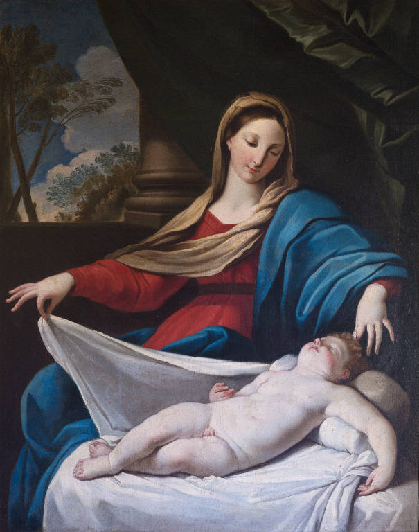 - NOTIZIE STORICO CRITICHE Il dipinto è stato avvicinato da Luciano Anelli ai modi di Giovanni Antonio Cappello. L'opera si inserisce nel filone della pittura devozionale che replica, con leggere varianti, il modello raffaellesco della Madonna con Bambino dormiente, conservato presso il Museo Condé a Chantilly, che ebbe una diffusione notevole grazie alle versioni di Guido Reni e del Sassoferrato.