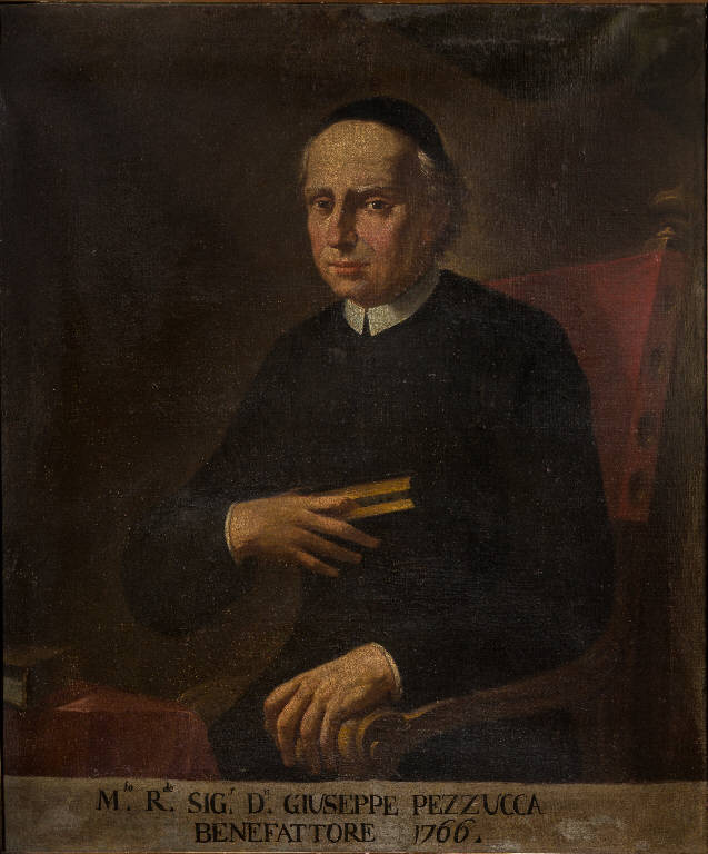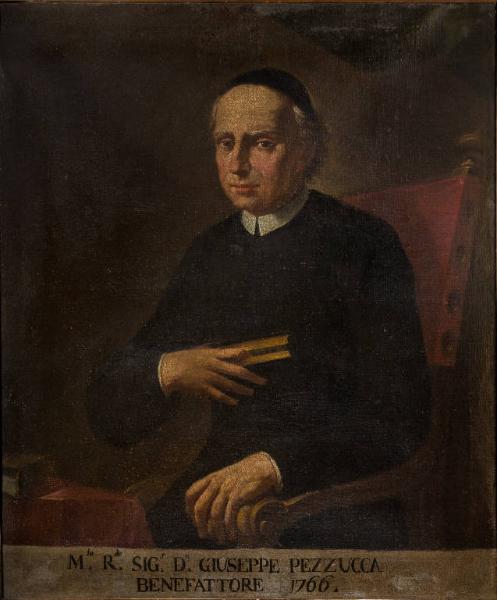 - NOTIZIE STORICO CRITICHE Il dipinto raffigura Giuseppe Pezzucca, padre superiore del Conservatorio della Carità, che tramite lascito testamentario, destinò la sue sostanze a diverse istituzioni di carità, inclusa la Casa di Dio, che entrò in possesso di una imprecisata somma di denaro dopo la morte dell'usufruttaria, la nipote Marta Pezzucca (1766). Il dipinto fu probabilmente realizzato, come indicherebbe l'iscrizione nella parte inferiore dell'opera, dopo quella data.