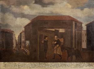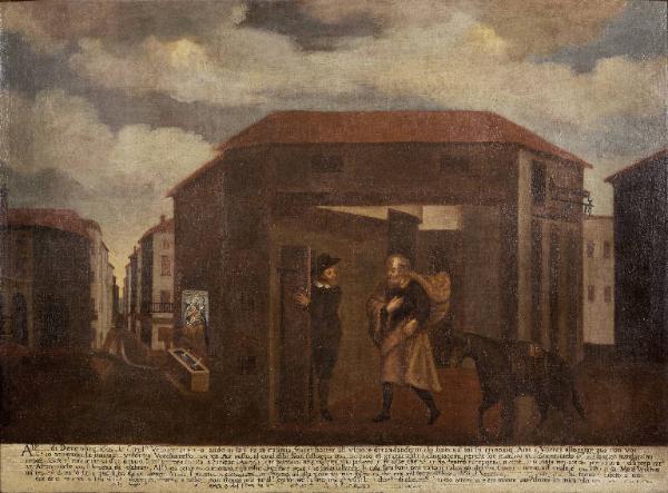 - NOTIZIE STORICO CRITICHE Il dipinto, con la relativa iscrizione, racconta dell'episodio miracoloso che portò alla costruzione della Chiesa di Santa Maria al mercato del lino. Secondo il racconto di Girolamo Venturelli, che abitava in piazza del Mercato, la sera del 2 dicembre 1604 un uomo, accompagnato da un asinello, chiese ospitalità presso la sua casa portando una cassetta di paramenti liturgici per celebrare messa. Alle resistenze del Venturelli, l'uomo insistette per restare, salvo poi scomparire misteriosamente. Nel 1608, nel luogo dove sorgeva la casa, si decise di costruire una chiesa dedicata alla Madonna, la cui immagine era dipinta sopra una fontana poco distante (da qui il nome Beata Vergine della Fontana, utilizzato alternativamente al tradizionale nome di Madonna del Lino). L'opera, di stretto carattere devozionale, ha forse costituito il modello per un' incisione di Antonio Dusi di grande diffusione.