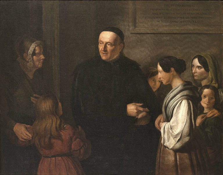 - NOTIZIE STORICO CRITICHE Il ritratto raffigura don Faustino Rossini, prevosto della chiesa di San Giovanni Evangelista, direttore e benefattore del pio luogo Pericolanti. Non si conosce la data esatta di esecuzione del dipinto, realizzato presumibilmente dopo la morte di Rossini (1836) e presentato all'esposizione annuale dell'Ateneo di Scienze Lettere e Arti, di cui Rottini era socio, nel 1839. Il dipinto supera gli accenti convenzionali delle opere di soggetto storico e sacro del pittore, per restituire un ritratto di gruppo a sfondo pedagogico che ha come fulcro l'espressione serena del volto del prelato ed il gesto solonne della mano.