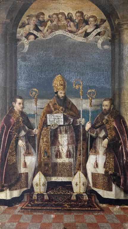 - NOTIZIE STORICO CRITICHE L'opera è indicata da tutte le guide artistiche antiche come lavoro di Luca Mombello. L'opera, proveniente dall'altare sinistro dell'originaria Chiesa di San Cosma e Damiano, fu poi adattata all'altare settecentesco.