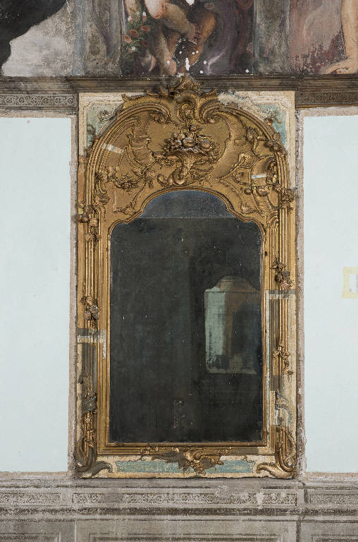 - NOTIZIE STORICO CRITICHE In un inventario databile al settimo-ottavo decennio del XVIII secolo che descrive beni e arredi di Palazzo Averoldi, sono citati quattro "specchi annicchiati" nella sala delle quattro stagioni dipinta da Romanino. Questo riferimento fissa il termine ante quem per la realizzazione della serie di quattro specchiere rococò oggetto della catalogazione. Il termine post quem per la loro commissione e realizzazione può essere, invece, fissato dopo l'agosto del 1738, data in cui Paolo Averoldi acquisisce la proprietà dell'intero palazzo fino ad allora pertinente a due rami distinti della famiglia. In questa occasione le sale del piano terreno del corpo di fabbrica centrale vengono rinnovate secondo moduli decorativi settecenteschi pur mantenedo la decorazione pittorica cinquecentesca. Lo stesso inventario del settimo- ottavo decennio del XVIII testimonia, infatti, la persistenza degli affreschi cinquecenteschi della volta, mentre le pareti della sala sono rivestite da tappezzeria entro la quale sono, appunto, inserite le specchiere. \nLe eleganti cornici lignee che circondano gli specchi sono state pesantemente e impropriamente dorate fra gli anni Sessanta e Settenta del Novecento, ma saggi di pulitura e stratigrafie condotte come fase preliminare di un futuro restauro mostrano che le finiture settecentesche originali sono ancora presenti. Sotto le vernici sintetiche novecentesche, persiste, infatti, una cromia delicata e puntuale con colori tenui nelle toanlità dell'avorio, dell'azzurro, del rosa e del verde.