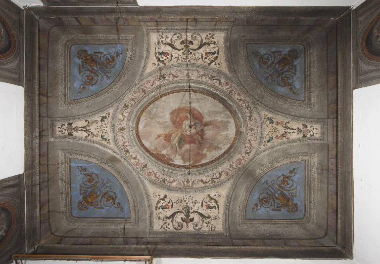 La decorazione consta di un ovato centrale figurato, di quattro riquadri angolari con motivi decorativi a grottesche dorati su fondo azzurro e di fasce di raccordo con motivi decorativi fitomorfi su fondo chiaro.