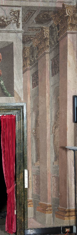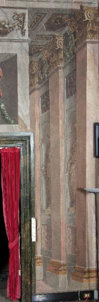 La decorazione pittorica si sviluppa a lato della porta dilatando lo spazio reale e fungendo da elemento di raccordo con il partito decorativo della parete successiva. Consta di tre paraste corinzie che, negli intercolumni, lasciano spazio a due nicchie con statue all'antica e a due finti bassorilievi raffiguranti un corteo; fra i capitelli, invece, si sviluppa un fregio con amorini e festoni di fiori e frutta.