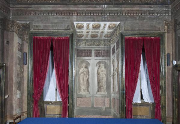 Attraverso una struttura archittetonica prospettica lo spazio reale della parete viene dilatato ed arricchito di elementi architettonici evocativi della cultura greco- romana. Da destra scandiscono lo spazio due paraste corinzie nel cui intercolumnio fanno capolino nicchie con statue all'antica, segue, nella parte centrale della parete fra la porta e la finestra, un ampia edicola con soffitto a lacunari e nicchie con statue all'antica. Fra il soffitto e le nicchie corre un elegante fregio a monocromo raffigurante amorini e un festone continuo di frutta e foglie.