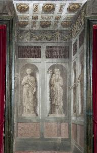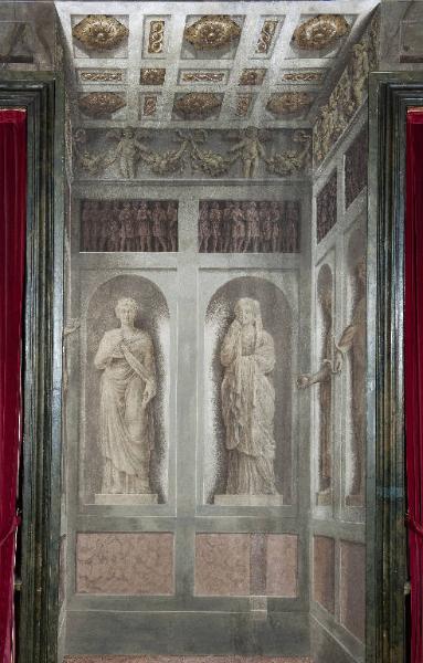 La decorazione pittorica crea, attraverso l'illusione prospettica, uno spazio caratterizzato da due nicchie con statue all'antica, un doppio partito decorativo che imita un bassorilievo e raffigura un corte e un fregio continuo con amorini e festoni di fiori e frutta.