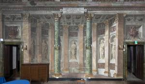 Attraverso una struttura archittetonica prospettica lo spazio reale della parete viene dilatato ed arricchito di elementi architettonici evocativi della cultura greco-romana. Sopra le porte viene creata una finta nicchia con al centro un vaso riccamente decorato; nello spazio centrale della parete, invece, una sequenza ritmata di paraste corinzie crea un emiciclo entro il quale sono collocate nicche con statue all'antica; due eleganti colonne in serpentino reggono il soffitto a lacunari, mentre un bassorilievo raffigura un corteo che confluisce sopra la nicchia della statua centrale.