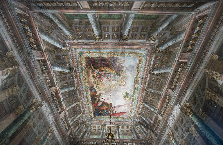 La decorazione pittorica della volta si compone di una articolata quadratura architettonica che finge una spaziosa galleria limitata da una balaustra. Su di essa si impostano colonnne corinzie con fusto in marmo verde e capitello dorato che sostengono una volta a cassettoni. Il parato architettonico si apre al centro per lasciare spazio all'ampia scena narrativa dedicata alla rievocazione della battaglia di Szalanken.