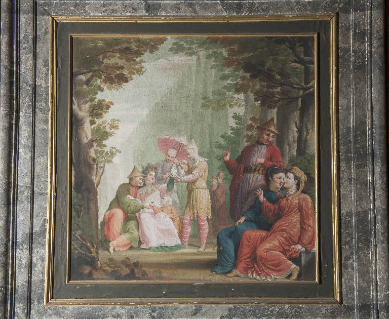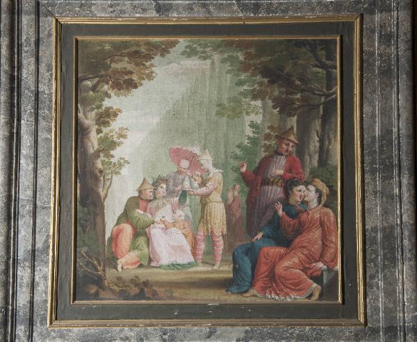 - NOTIZIE STORICO CRITICHE La cosiddetta Sala Cinese di Palazzo Averoldi - identificata anticamente come Sala Verde - costituisce un unicum nel territorio bresciano per la decorazione a pannelli lignei laccati di soggetto orientale realizzati con fondo verde e figure in ocra. Attualmente si presenta come un insieme unitario e apparentemente omogeneo in tutti i suoi elementi che comprendono, oltre alla boiserie anche quattro dipinti sovraporte, una controsoffittatura lignea con dipinti su tavola e su tela e un fregio a con motivi a grottesche. Come tale è sempre stato interpretato dalla critica che considera degli originali cinesi le lacche componenti la boiserie e attribuisce le sovraporte e il medaglione centrale della volta alternativamente a Manfredini (Tanzi) o Teosa (Cretella). \nIn realtà le ricerche archivistiche e la ricostruzione delle vicende storico - architettoniche di Palazzo Averoldi condotte da Pietro Balzani per la redazione della sua tesi di laurea (proposta in bibliografia) hanno fatto emergere alcuni significativi elementi che mostrano come l'aspetto attuale della sala sia frutto di interventi cronologicamente distinti e ascrivibili a diverse personalità artistiche.\nLa boiserie composta da dipinti di tema orientale risulta essere l'elemento più antico della sala, messo in opera, probabilmente, fra gli anni Cinquanta e Settanta del Settecento. Alcuni inventari relativi ai beni e agli arredi di palazzo Averoldi risalenti alla metà del Settecento ed in particolare uno, databile agli anni 70/80 dello stesso secolo, citano ripetutamente una sala verde che viene usata come salotto da ricevimento e può essere facilmente identificata come la Sala cinese (il verde diventa l'elemento qualificativo della stanza ed è riduttivo ritenere che sia dovuto a una semplice tinteggiatura delle pareti, è più credibile immaginarlo riferito alla boiserie in stile orientale, prepotentemente caratterizzata da questo colore). Questa ricostruzione cronologica trova conferma anche in un accordo stipulato nel novembre del 1791 con il signor Girolamo Romano che riceve l'incarico per il "ristauro delle Assi, che servono di Tapezzeria alla stanza Verde accomodata alla Chinese, con figure ed alberi d'oro". E' una frase essenziale, ma in essa può trovare conferma la datazione proposta da Balzani per la realizzazione della boiserie fissata alla metà del Settecento. Se nel 1791, infatti, i pannelli in stile orientale necessitano di un intervento di restauro, è decisamente plausibile che siano in opera almeno da qualche decennio. Un secondo elemento che emerge è la relazione con i lavori di ammodernamento, ampliamento e decorazione pittorica che, proprio nell'ultimo decennio del XVIII secolo, si stanno svolgendo nelle sale limitrofe del palazzo che fanno parte del grande appartamento da parata voluto da Faustino e Giuseppe Chizzola. Le altre stanze vengono "fatte a nuovo", mentre nella sala verde vengono mantenute e restaurate le lacche, probabilmente perché viene riconosciuto loro un valore di unicità. Questo non significa, però, che anche qui non siano previsti interventi di ammodernamento. Balzani ha, infatti, rinvenuto nell'archivio privato della famiglia Averoldi pagamenti e accordi con Saverio Gandini per le opere realizzate e da realizzare nella camera verde (è documentato un saldo il 5 gennaio del 1791 per le opere fatte fino a quella data e un accordo datato allo stesso giorno per opere "da farsi" sempre nella camera verde). Stando ai documenti, Gandini deve coordinare il falegname incaricato di realizzare il controsoffitto ligneo e i pannelli che rivestono la parte inferiore delle pareti e di procedere, poi, al loro decoro. Si deve occupare anche del cornicione con le mensole e il fregio e di tutte le campiture della volta ad esclusione del medaglione centrale. Quest'ultimo spetta ad un pittore di figura che può essere identificato con Giuseppe Teosa che riceve dei cospicui pagamenti nel corso del 1791. Per la doratura del cornicione del soffitto interviene anche il doratore Giuseppe Mondini come testimonia una fattura emessa il 24 giugno 1791. Questi nuovi elementi documentari e le precisazioni cronologiche riaprono il dibattito critico relativo ai tempi e ai modi alla diffusione del gusto orientaleggiante nel territorio bresciano e sull'autografia dei pannelli lignei che già Stefania Cretella riteneva essere non originali cinesi, ma "dipinti in stile".