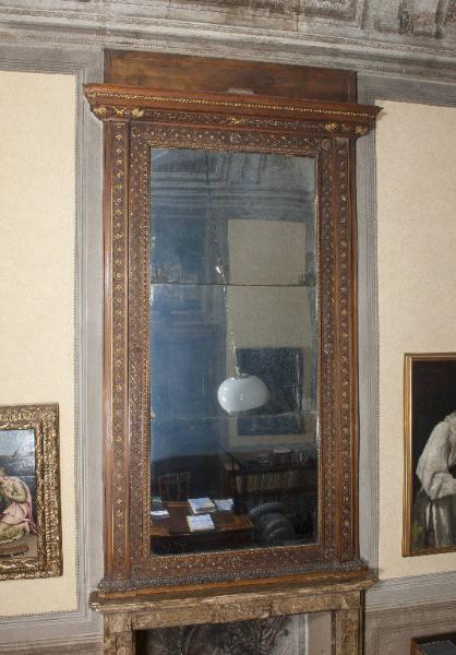 Caminiera con specchio tripartito e cornice decorata a rilievo con motivi geometrici, elementi a cuore e fiorellini a rilievo dorati. Il coronamento superiore è architravato ed aggettante ed è sostenuto da due paraste con profili modanati e rilevati. La base sagomata è decorata a fogliette.