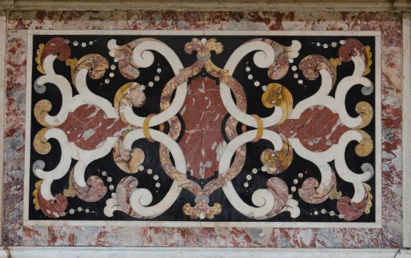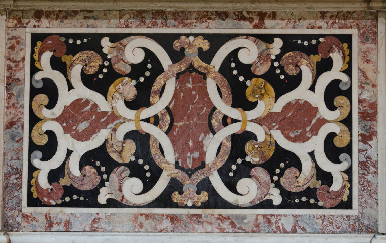 Il paliotto presenta una raffinata decorazione in cui le geometrie degli elementi decorativi si aprono ad un cauto naturalismo: da un medaglione centrale in marmo rosso profilato in nero e giallo si dipartono volute in marmo bianco che si aprono, alle estremità, in foglie stilizzate policrome. Il fondo è in marmo nero.