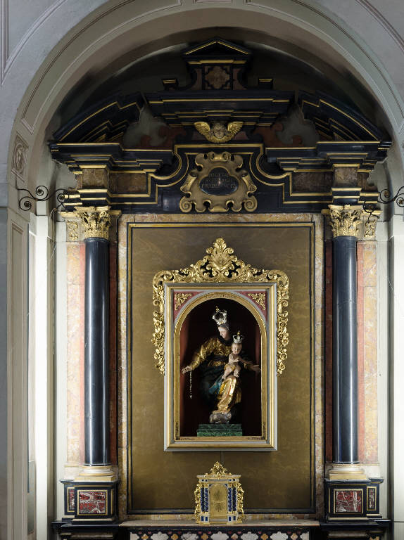 Ancona di ispirazione architettonica: su due alti plinti si basano due colonne con capitello corinzio dorato che reggono un architrave spezzato entro il quale si innesta un elemento architettonico modanato e timpanato. La cromia dell'insieme, giocata sull'alternanza dell'oro e del nero, è certamente legata alla titolazione dell'altare come documenta la cartella a cartocci posta al centro dell'architrave.