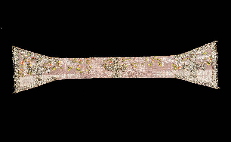 - NOTIZIE STORICO CRITICHE Il parato, nel suo insieme di stola, manipolo e borsa, non è documentato relativamente ad una commissione specifica. Visto il motivo decorativo del tessuto ed il colore rosaceo chiesto dalla liturgia solo due volte l'anno, si può ipotizzare che esso siastato confezionato con il tessuto di reimpiego di un abito femminile.