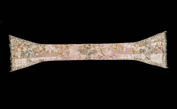 Il manipolo è confezionato con il medesimo tessuto rosa a meandro della pianeta e della stola. Conserva la fodera in lino cerato originale e i galloni in filo d'argento lavorato a fuselli.