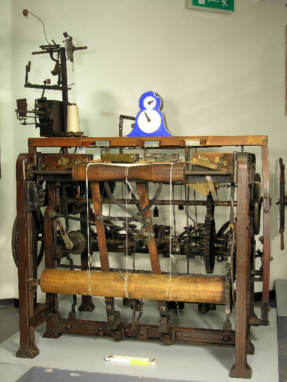 La macchina funziona con due navette, presenti e alloggiate attualmente nelle apposite sedi, che lavorano insieme con sincronismo perfetto e creano una maglia intrecciata con un occhiello al centro. Una serie di n°10 pesi in ferro permettono di mantenere costante la tensione dei fili coinvolti. Il funzionamento della macchina è a motore; è presente un'etichetta metallica applicata: "Marelli/Motore asincrono trifase/n°3690885..../Ercole Marelli&C SA Milano". Sulla sinistra della macchina è montato un congegno (più recente) per avvolgere le spolette che alimentano le due navette; una piastra fusa porta il logo "MM"; l'albero motore del congegno termina con una puleggia scanalata che permette il collegamento tramite cinghia con il motore elettrico della macchina per le maglie (collocato poco sotto), collegamento che doveva avvenire tramite uno o più ingranaggi, attualmente non presenti.
