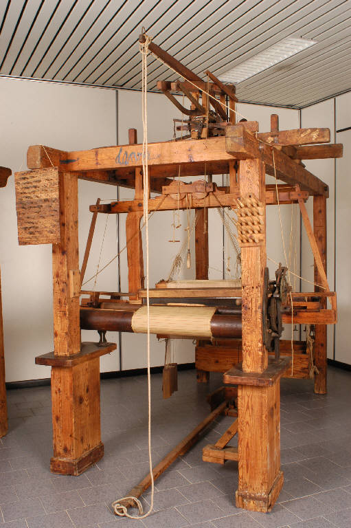 Il telaio è montato con 8 licci a maglie in cotone (ma la struttura del telaio consente di montarne 16). E' dotato di macchina ratière a due cilindri, con cassa battente a due cassette per parte (che permettono di utilizzare due navette e quindi due trame, con effetti colorati in tessimento, anche con trame dispari). Il disegno viene letto su tavolette di legno con pioli.