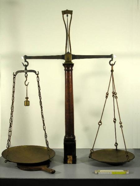 Bilancia a due bracci uguali, con colonna in legno e piatti in ottone. Colonna in legno tornita e decorata con due capitelli, uno in alto e uno alla base. Indice in acciaio verso l'alto. Coltelli e piani di appoggio in acciaio riportato. Giogo in acciaio con le estremità "a scatola aperta", entrambe terminanti con un gancio aperto; punzonatura "PORTATA CHILOGR 20". Il gancio di destra porta un piatto circolare di ottone sostenuto da tre catene a segmenti rigidi, riunite in un anello sospeso al gancio. Il gancio di sinistra porta un piatto circolare di ottone, più grande del precedente, sostenuto da 4 catene ad anelli, riunite a coppie, ciascuna in un anello. I due anelli sono sospesi ai ganci aperti di un supporto a due bracci, sostenuto, tramite un anello, dal gancio terminale del giogo. Al centro dei due bracci è sospeso un gancio aperto supplementare. La staffa su cui poggia il giogo è in ottone e continua verso l'alto, nella parte posteriore, con una piastra traforata, sempre in ottone, con scala graduata incisa, di riferimento per l'indice. Punzonature sul giogo, sulla sola faccia anteriore: (71 72) (73 74) (83 84) (91 92) (93 94) (99 00) (01 02) (03 04) (05 06) (07 08) (09 10) (11 12) (13 14) (15 16) (19 20) (23 24) (21 22) (25 26) (27 28) (29 30) (31 32) (33 34) (35 36) (41 42) (43 44) (47 48) (49 50) (51 52) (53 54) (55 56) (59 60) (61 62) (63 64) (65 66) (06) (84) (89); cartiglio con "CA" sovrastato da una croce a bracci uguali; cartiglio con scudo crociato sovrastato da una corona; cartiglio ovale con stemma poco leggibile circondato da una ghirlanda di foglie; punzonature "Y", "I", "V"; sul solo piatto grande punzonatura "X" e "Q". Sulla faccia posteriore della bilancia, sulla scatola in ottone che porta il giogo "ROSA"