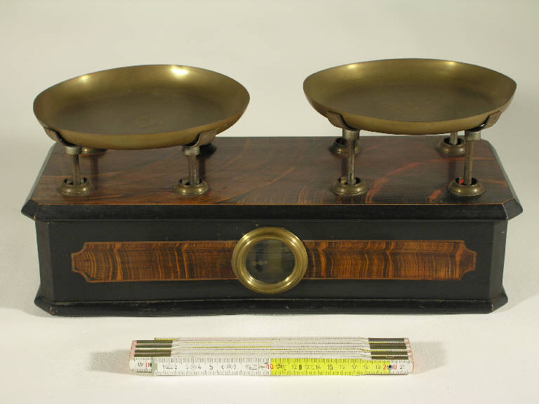 Bilancia a sospensione inferiore tipo Béranger. Base della bilancia in legno dipinto disegno radica. Due piatti uguali, in ottone, rotondi, a ciotola. Su entrambi i piatti: punzonatura "P. CINQUE CHILOG"; non sono presenti vidimazioni annuali; cartiglio con scudo crociato sovrastato da una corona; bollo rotondo con "238" sovrastato da una corona
