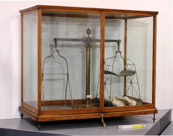 Bilancia a bracci uguali, in vetrina, per la pesatura di precisione delle matasse. Teca in legno a vetri, con due ante .La colonna centrale, in ottone, è infissa nel pavimento della teca ed è decorata con due capitelli, in alto e alla base. Giogo in acciaio. Estremità del giogo a staffa, con staffa (in ottone) dotata di un gancio (in acciaio) per la sospensione dei piatti. Indice in acciaio verso il basso, riportato (inserito e saldato) su un supporto semicircolare fissato sul giogo; lettura su una scala graduata in avorio fissata al piede della colonna. Sopra il giogo, in posizione centrale, un medaglione rotondo, in ottone, sovrastato da una piccola cuspide in acciaio. Coltelli e piani d'appoggio in acciaio. Piatto di sinistra, portapesi: a due ripiani, sospeso con aste rigide, ottone nichelato (?). Piatto di destra, portamatasse: forma a cestello, a due piani, sospeso con aste rigide, ottone nichelato (?). Su entrambi i piatti: punzonature "P. DUE CHILOGRAMMI" e vidimazioni annuali: (15 16) (su un solo piatto), (21 22) (23 24) (29 30) (31 32) (33 34) (35 36) (37 38) (39 40) (43 44) (45 46) (49 50) (51 52) (53 54) (55 56) (59 60) (61 62) (63 64) (67 68) (73 74) (77 78); cartiglio con scudo (crociato?) sovrastato da una corona; piccolo bollo ovale "C D" separate da una stellina; piccolo bollo rotondo con "339" oppure "309" sovrastato da una corona. Etichetta in ottone alla base della teca, nel punto di chiusura delle ante: "D. Canzi - Milano"