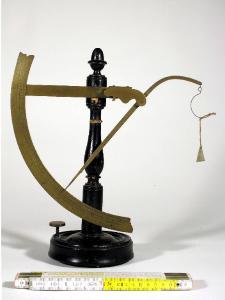 Bilancino titolatore, bilancia a pendolo. Lo strumento si compone di una colonna centrale in legno che appoggia su un basamento circolare con una vite per l'esatto livellamento del bilancino sul piano. Un grande arco metallico (ottone), sul quale sfiora il braccio di un indice, segna direttamente in "denari" il peso del provino appeso al gancio portato dall'estremità superiore all'indice stesso. L'arco è graduato da 0 a 60 unità, con numero ogni 5 unità, e graduazione ogni 5 e una unità. Lo strumento è corredato da un pesino da 30 denari, per la taratura. Sopra la scala: "BANDA G.Villa - Milano"