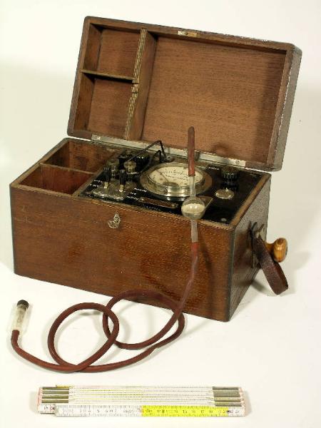 Lo strumento è fissato entro una cassetta di legno con coperchio incernierato, chiusura con serratura a chiave, cinghia di cuoio per il trasporto. Aprendo il coperchio sono visibili un vano per l'alloggiamento della sonda per la rilevazione dei solventi (tubo di gomma con imbocco iniziale in vetro e ampolla di filtrazione in vetro) e il frontale dello strumento con le scale di lettura e i comandi. Etichetta metallica sul frontale: "Dr. Kroeber & Sohn GMBH - Treuenbrietzen". Etichetta metallica all'interno del coperchio "App. n°139"