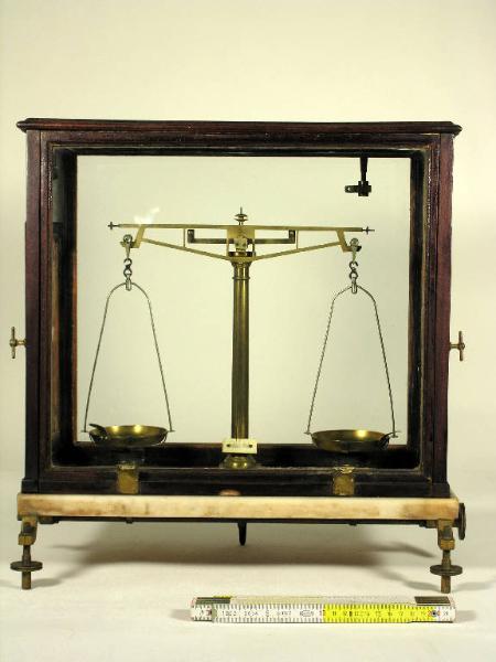 Bilancia di precisione a due bracci uguali, a colonna, in vetrina. Teca in legno e vetro, base marmo, piedini in ottone, di cui uno regolabile per la messa in piano. Giogo in ottone traforato di forma triangolare, con elemento decorativo nella parte centrale superiore. L'asta superiore è graduata, per la sospensione del "cavaliere" e all'estremità porta le viti per la regolazione del baricentro. Coltelli in acciaio riportati e piani d'appoggio in agata. Sospensioni a staffa in ottone nichelato con ganci e aste rigide per la sospensione dei piatti. Indice riportato verso il basso in acciaio, e scala graduata di riferimento in avorio fissata al piede della colonna. La colonna è in ottone tornito, con base d'appoggio a capitello ed è dotata di due bracci in ottone utilizzati per mettere in posizione di riposo il giogo, con comando esterno alla vetrina. Piatti in ottone rotondi a ciotola, appoggiati ad un supporto a croce che si prolunga in due aste rigide. Sui piatti 3 punzonature: cartiglio con scudo sovrastato da una corona, punzone rotondo con "211" sovrastato da una corona, punzone triangolare con le lettere "PV" sovrastate da una stella, e "P. CENTO GR"; non ci sono vidimazioni annuali.
