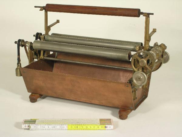 L'apparecchio si compone di una vasca e di un soprastante sistema di cilindri orizzontali che mantengono in tensione il tessuto, evitando che formi pieghe (che causerebbero difetti della tintura). Etichetta metallica: "Officine Meccaniche- Fonderie / Cairoli-Fontana-Lanfranconi / Via Pannilani 1 / Como / telegr Excelsior / Pompe, macchine ed apparecchiature per: Tintoria, Apparecchiatura, Tessitura"