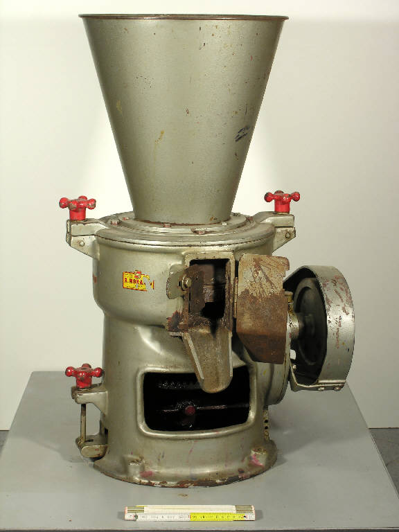 La macchina è costituita da un imbuto in cui si versano gli ingredienti da macinare e da un motore (parzialmente a vista) per la macinazione: il prodotto esce da un becco anteriore. La macchina si può aprire all'altezza della base dell'imbuto, con due viti a farfalla. Etichetta adesiva (rovinata) sul corppo macchina: "Macchine Chimiche R.Morandi - MRM - Milano". Etichetta metallica sul motore: "CIEM Cinisello (MI) - Motore asincrono 3 fase - N°: 3278 - Tipo: CR80BN4 - HP: 1 - n.: 1380 - Hz: 50 - Coll (serie?): V 220, A 3,5 - Coll. (parallelo?): V 380, A 2,02 - servizio continuo"