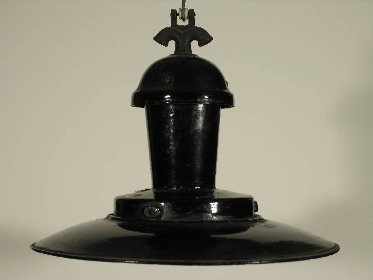 Lampadario in ferro smaltato nero, con paralume leggermento svasato e isolatore in porcellana