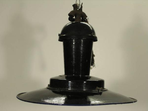 Lampadario in ferro smaltato nero, con paralume leggermento svasato e isolatore in porcellana