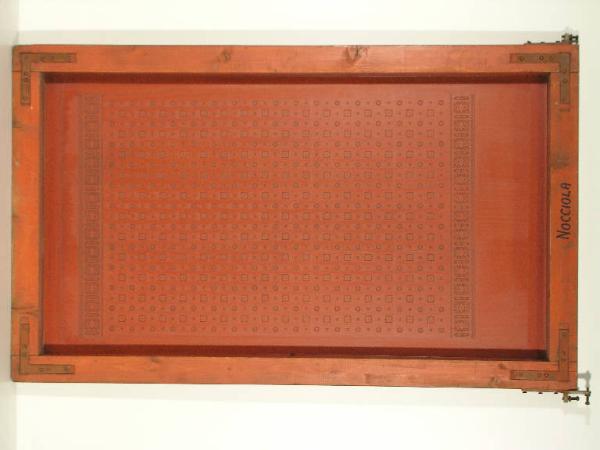 L'oggetto è costituito da una cornice di legno sulla quale è teso e fissato con chiodi il buratto fotoinciso. Due viti metalliche alle estremità di un lato corto servono per fermare il quadro nelle apposite sedi fissate lungo la guida in ferro che corre parallela al tavolo da stampa: la loro funzione è segnare il rapporto del quadro. Su un fianco è dipinto il numero del disegno: "11226"