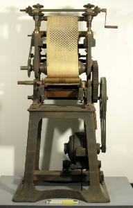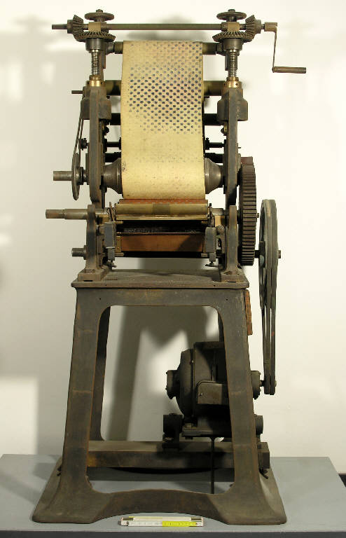 Un supporto in ghisa porta la macchina, collocata ad altezza tale da consentirne l'utilizzo in piedi. La macchina, azionata da un motore, è costituita da diverse parti che permettono la stampa di un campione di tessuto: una coppia di subbi portano un feltro che fa da base di appoggio al tessuto; una vasca, in basso, contiene il colore di stampa; una spazzola si sporca di colore e lo trasferisce sul cilindro da stampa inciso, mentre quello in eccesso viene raschiato da una lama; il tessuto da stampare passa fra il subbio che porta il feltro e il cilindro inciso, ricevendone la stampa. Due piastre fuse sul motore: "Ercole Marelli & C. - SA Milano - Sesto San Giovanni" e "Ord. N°: 58129 - Tipo: AN 10/6 - HP: 0,8 - KW: 0,59 - Volt: 127/220 - Amp: 5,5-3,15 - Periodi: 50 - Giri: 940"