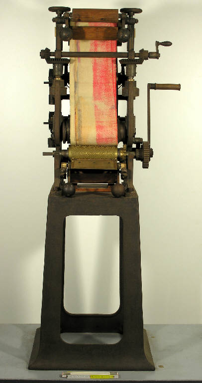 Un supporto in ghisa porta la macchina, collocata ad altezza tale da consentirne l'utilizzo in piedi. La macchina, azionata manualmente, è costituita da diverse parti che permettono la stampa di un campione di tessuto: una coppia di subbi portano un feltro continuo che fa da base di appoggio al tessuto; una vasca, in basso, contiene il colore di stampa; una spazzola si sporca di colore e lo trasferisce sul cilindro da stampa inciso (in ottone, lungo cm 22 e montato su un mandrino in acciaio), mentre quello in eccesso viene raschiato da una lama; il tessuto da stampare passa fra il subbio che porta il feltro e il cilindro inciso, ricevendone la stampa. Fusione sul fianco macchina " DUCOMMUN"