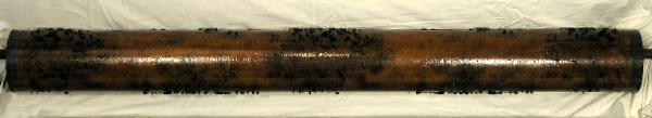 Cilindro in legno con motivi da stampare in ottone: sono lamine ed elementi vari, inseriti nel legno e sporgenti da questo per un'altezza di alcuni millimetri. I motivi in rilievo sono quelli che dovranno essere stampati di un solo colore: il disegno è però riportato per intero a china sul cilindro